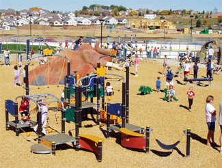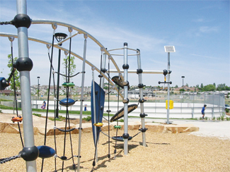 Completed in October 2003, the award-winning, $9.6 million, 100-acre Fossil Creek Park offers a prime example of what we call the “destination playground.” Playgrounds are no longer just for toddlers, but places where the whole family spends a good part of the day playing, meeting friends, and picnicking. With public art and a choice of activities nearby, the destination playground draws from across the community and even the region. This particular day, for example, drew families from Boulder and Denver.