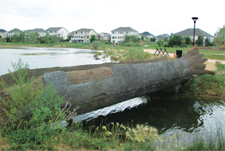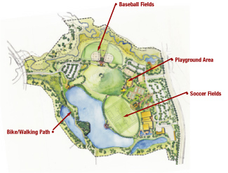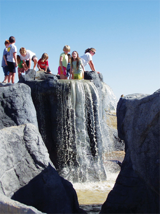 Across a lake, an interactive water feature was designed around a theme of the “watering hole.” A grotto features waterfall columns, with cascades flowing down into a series of runnels that snakes around the water’s edge. Children can splash and play in the “stream” of recycling water. A fun place to play, this water feature was far less expensive than building a pool. (A future construction phase will include a swimming pool and recreation center in the park.)