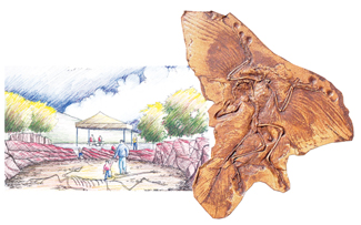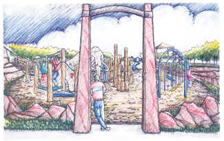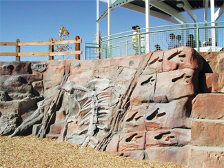 We selected a site on the east side of the park, conveniently adjacent to South Lemay for parking. The playground and a climbing wall were carved out of a knoll in the middle of the site, creating the feeling of being in a paleontologic dig. We designed the wall to look like it had just been excavated, revealing fossils of footprints and vertebrae that form the toeholds and handgrips for climbers. On one side of the climbing surface are steps and a slide; on the other is a sandstone-block retaining wall for seating and climbing, with a viewing platform/picnic shelter above it.