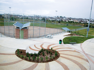 Structures within the park include a maintenance center, an earth-sheltered restroom and concession building with a rooftop viewing deck, and several custom-designed shade and picnic shelters. The park also features built-in concrete grandstands and dugouts for the two lighted ball fields. The roller-hockey rink and tennis courts were built on post-tensioned slabs, with one inch of asphalt on six inches of concrete strengthened by steel so the surfaces won’t crack.