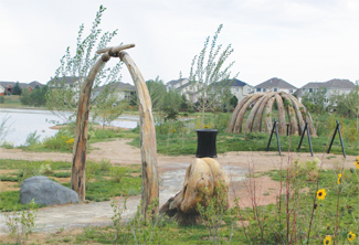 Connected to the perimeter trail by two bridges—one of them a concrete fabrication of a huge log—Adventure Island features a dome-shaped “tusk hut” designed from discoveries of prehistoric human settlements in North America. Willows, sumacs, and groves of cottonwoods create hiding places, and the muddy shoreline beckons little feet. As the plants grow, we envision a kind of jungle-paradise with narrow paths winding through it.