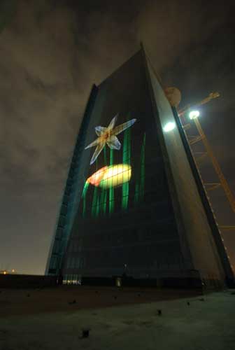 This is a new form of very large-scale digital display that is almost transparent for the occupants of the buildings on which it is mounted. This new kind of dynamic skin can display a wide range of content and messages including graphical, artistic, cartoons, videos, news, photos and events etc.