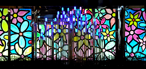 The winning concept – an arrangement of LED reeds and integrated sound in planters along the sidewalks – was designed to drive interest and interaction along the street. The project resulted in a one-of-a-kind experience for residents and tourists that changes with the seasons. The sandblasted acrylic tops on the head assemblies were designed to contain LED fixtures, functioning as stylized beacons instead of projecting light in a particular direction. The housing was fitted specially to the acrylic reeds, which were custom-made from aircraft-grade spun fiberglass. The material was chosen in part for its flexibility, allowing the reeds to sway in the wind. Each of the 56 reeds runs on only three watts, with red, blue and green programmable LED, using DMX protocols that are refreshed 40 times each second via a custom wireless network. Every reed in the 18 cluster locations has a unique DMX address for customization. Located along seven blocks of State Street, the installation features clusters of custom LED fixtures in 18 planters. Between 9am and 10pm each day, the installation's embedded speakers broadcast musical selections and special announcements as the lights change patterns in synchronization with the music. For instance, during the month of February, the community submitted their favorite love songs, which were played with an accompanying light show as people strolled throughout the corridor.