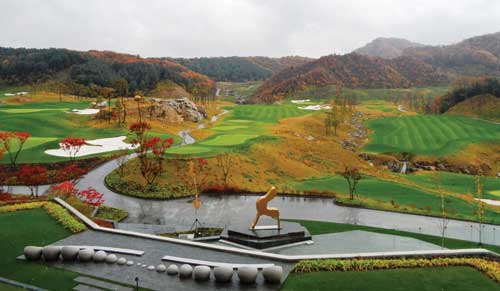 The starter house garden at Whistling Rock Country Club shines bright in the South Korean sky as a great example of how to combine function with sculpture. The landscape architects, Pinnacle Design Co. of Palm Desert, Calif., were challenged by the chairman of the Taekwang Group to provide a functional outdoor space adjacent to a starter teahouse, but also to create a "night and day" display space for the large art piece he'd purchased. The award-winning clubhouse and golf course, which opened in the fall of 2011, have become somewhat of a showcase for his collection. The art piece is a 3.4 meter tall gold abstract sculpture of a horse designed by Rotraut Uecker. Standing tall above an organically-arranged plaza space, the horse "floats" on a raised pool of water, drawing the attention of golfers as they begin their day on the course. The horse sits off-center in the space to open up the best views of the course.