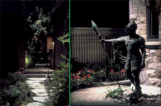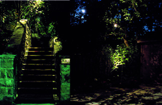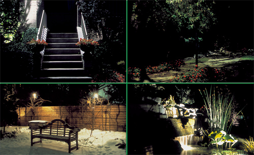 Clockwise from top left: Lighted stairs lower risk and lower insurance premiums. A well lit path identifies possible trip hazards. A well placed underwater light creates a canvas for the landscape and enhances safety of the area. An illuminated courtyard conveys the message of ?EUR??,,????'??It?EUR??,,????'???s safe here.?EUR??,,????'??