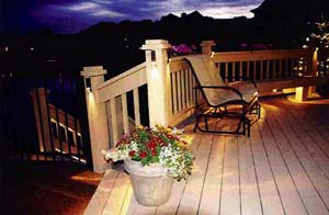 Decks are always a challenge when it comes to lighting. On the back of one home, Feller used "up-and-down" lights, which are open at both ends, on the deck itself and on the stairs leading up to it. Placed vertically, the fixture lights the area both above and below the deck; positioned horizontally on the staircases risers, the lamp illuminates both sides of each step. This system solves the sites lighting problem, while maintaining an attractive consistency of fixtures throughout the deck area. At this site, spotlights were also used to emphasize the owners trees. Since the trees were relatively young, a minimum of light was required to highlight them. (When spotlights are used to illuminate trees, multiple fixtures can also be positioned so that their beams cross one another, and then cross again, creating especially interesting lighting effects.)