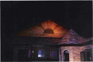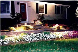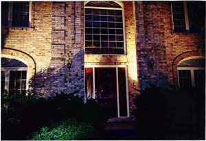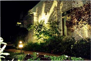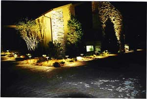 Spotlights were used to highlight the home itself, providing an enhancement both to the owners security system and to the appearance of the house. The optimal placement of spotlights is an art in itself. Spotlights should be positioned far enough from the building to wash it gracefully with graduated light (an effect that will be lost if the light is placed too close to the house). Care must also be taken to ensure that the light will not shine into the windows of the building, disturbing its occupants, or into the eyes of anyone approaching the house on the path or sidewalk. In general, spotlights are best placed in a bed with vegetation.