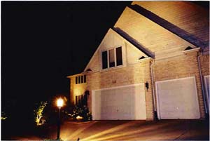 Sometimes, rather than having a problem to be solved, a homeowner simply wishes to highlight a particularly striking or favorite feature of the property. At this site in Bloomingdale, Ill., Feller used spotlights to bring out the dramatic stone texture of the homes construction. At another house in Wayne, Ill., Feller positioned a spotlight on the roof to light up the buildings massive main gable. In a situation like this, of coursewhere a light is placed in a less accessible spotthe owner needs to consider maintenance issues as well as aesthetic effect. (The same holds true when spotlights are placed high on the trunks of deciduous trees to light up their canopies.) Fellers representatives always make sure that owners understand the cost and safety issues raised by such placements before completing the design for the project.