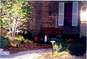 The plantings on a property may also determine the types of fixtures used. At this site in Lombard, Ill., for example, the owner chose hammered-roof path lights (by Kichler Landscape Lighting) to add an ornamental touch to immature plantings. With their delicate shape and intricate cutouts (which create interesting patterns of light and shade), these lamps are as beautiful on their own as they will be when surrounded by mature vegetation. At this property, garage lights that match the lights placed in front of the house were also used to carry the aesthetic theme through the entire installation.
