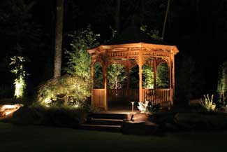 Low-voltage landscape lighting in the backyard is on the BBQ walls, illuminates the patio perimeter, accents the specimen plants and the rock ledge and steps and landings leading to the upper lawn area. Additional lighting went around the gazebo and fire pit.