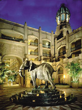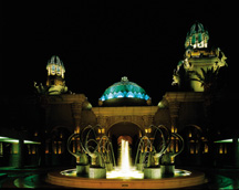 The soft landscape lighting and interior lighting of the Palace was complete, but the architectural exterior and hard landscape lighting were not. Two lighting designers had already been brought in and dismissed. The Palace was scheduled to open in four months. The Palace of the Lost City is a 352-room luxury hotel located two hours northwest of Johannesburg, South Africa in the city of Bophuthatswana. With four months left before the opening, Jerry Allison of Palace architects Wimberly Allison Tong & Goo (WATG) saw an advertisement that GE Lighting ran publicizing the Edison Award and a project called the Palace of the Fine Arts, a project Ross De Alessi received the GE Edison Award for. Allison immediately called De Alessi and said he had another palace that needed some light. ?EUR??,,????'??The owner was on his second lighting designer, a local guy, who wanted to submerge high pressure sodium uplights in the surrounding moat and backlight open parapet walls with the same source,?EUR??,,????'?? De Alessi said. ?EUR??,,????'??This is a disaster waiting to happen. We performed a mock-up in August on once center section of fa??? 1/4 ade, the owner was pleased, socked me in the arm and said, ?EUR??,,????'??Where in the hell were you when I needed you??EUR??,,????'????EUR??,,????'?? De Alessi discussed goals for the project with the owner and he centered his design on several concepts. ?EUR??,,????'??The theme was established by Allison that a nomadic tribe settled in this lovely valley and built a palace and surrounding city and gardens to honor its king, queen and people,?EUR??,,????'?? De Alessi said. ?EUR??,,????'??The city was destroyed by an earthquake, the tribe moved on and the Palace became engulfed in creeper and weed only to be discovered one day by an Indiana Jones type person. It was ?EUR??,,????'??rebuilt?EUR??,,????'??? into the glorious resort it is today.?EUR??,,????'?? De Alessi quickly began working on a design and mock-up as they were due two days after he arrived. The mock-up was approved, but according to De Alessi the conduit and outlets that were previously installed were in the wrong places for the new plan. The power points were installed in front of columns and De Alessi needed them between columns. The migrant labor force of nearly 5,000 working on the project began the task of removing tiles by hand so pipe could be rerouted to the new power points. ?EUR??,,????'??The gritty methods of construction were fascinating,?EUR??,,????'?? De Alessi said. ?EUR??,,????'??Cement products are mixed on the floor like ladling gravy into mashed potatoes and concrete was chipped rather than sawcut. What makes this so interesting is that when you tour pump rooms for immense water features, the system is state-of-the-art and perfectly maintained yet just outside men move dirt with wheelbarrows not backhoes and D9s. The beauty of this is it keeps many people employed for years.?EUR??,,????'?? Because of import duties, De Alessi held the use of American equipment to a minimum-mostly asymmetric and fountain lighting fixtures. Most of the lights used were modified South African PAR and fluorescent lampholders. ?EUR??,,????'??Exchange rates were lousy and the importation of sophisticated equipment was limited,?EUR??,,????'?? De Alessi said. ?EUR??,,????'??The biggest challenge was working with local manufacturers to get desired effects. They worked hard and so did we. In this situation, you make compromises for the overall effect.?EUR??,,????'?? Because a lot of guests arrive to the Palace late at night, De Alessi wanted it to look like somebody was always home, living in the unoccupied parts of the towers. What he did was use modern equipment to simulate ancient forms of illumination such as flames from burning torches. The towers are the first thing travelers notice on the road. The tallest tower is distinguished by a flame burning within its dome. To provide balance with the other solely lit tower domes and to enhance the effect of the torch burning the large dome has been uplit with MR 16s. Due to the tower?EUR??,,????'???s large size the walls on the outside of it were lit differently than the other two towers. Asymmetric 120-volt quartz 350/500-watt floodlights have been used with transformers that provide the needed lumen output within the energy constraints. The exterior walls of the other towers are lit with 300-watt quartz floodlights positioned against the tower wall so that it bounces light off a reflector built into the balustrade and back onto the wall to create a soft glow. According to De Alessi the deck behind the balustrade also glows and creates the illusion that there?EUR??,,????'???s a burning brazier out on the deck, accompanied by guests enjoying the night air even though those decks are uninhabited. The domes and external walls are controlled separately to reach to 100 percent brightness at dusk, and dim to 60 percent over one hour. Most of the control switches are housed in each of the towers. The Rotunda The Rotunda dome is illuminated with a multi-tiered. The base is surrounded with 1500mm cool white fluorescent lamps in lensed uplight fixtures that complement the color of the large leaves on the dome. The center is lit by roof-mounted, dimmed PAR 56 heads outfitted with snoots and luvers. The finial is lit with two 12-volt, 5-degree pinspots. The lions on either side of the dome are uplit with lensed, louvered and snooted MR 16s. All the fixtures are positioned so that they are concealed from viewing by guests, whose rooms go around the Rotunda. In front of the Rotunda is a kudu fountain where water shoots from the horns of the animals. The water is lit with a white non-filtered, submersible niche-mounted MR 16s with linear spread lenses. De Alessi said that with South Africa?EUR??,,????'???s 240-volt, 50 Hz line voltage, filament sizes of lamps must be quite large. He said using the 12-volt MR 16 fixtures is a must for critical focal lighting. A Cheetah fo
