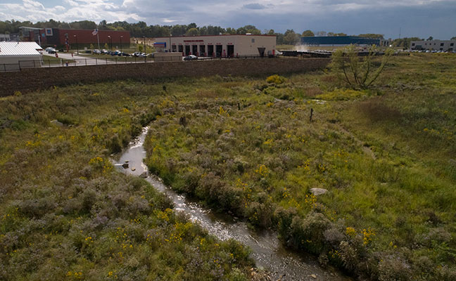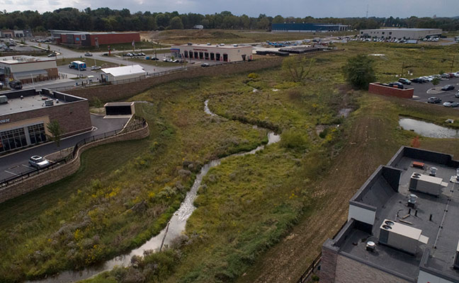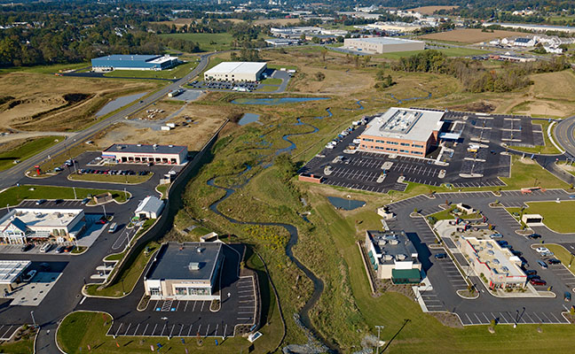 The 98-acre development features 25 retail, commercial, warehousing, and medical office uses surrounding the 11.5 acres of restored floodplain. With a construction budget of $125 million, the 642,000-sf mixed use project balances economic development with ecological benefits for the community. Offering a unique approach to post construction stormwater management, a floodplain restoration was implemented as the primary BMP (in lieu of conventional infiltration or detention facilities) to meet the regulatory requirements. This approach includes the removal of sediment to reconnect the stream channel with the floodplain, the creation of large areas of interconnected wetland habitats, and the rehabilitation of groundwater interchange. To have your project featured in LASN or on LandscapeArchitect.com please email: Dherbold@landscapearchitect.com For more information about submitting a project, go to: https://landscapearchitect.com/research/editorial/editorial-submissions.php The benefits of a floodplain restoration include peak runoff rate reduction, enhanced groundwater recharge, suspended sediment reduction, and nitrogen and phosphorus load reductions, as well as significant ecological and aesthetic improvements.