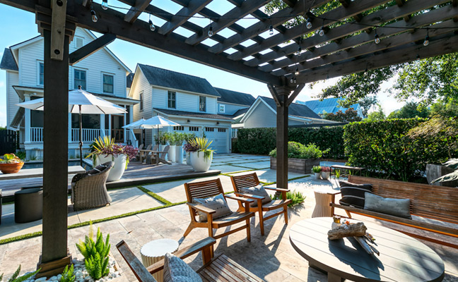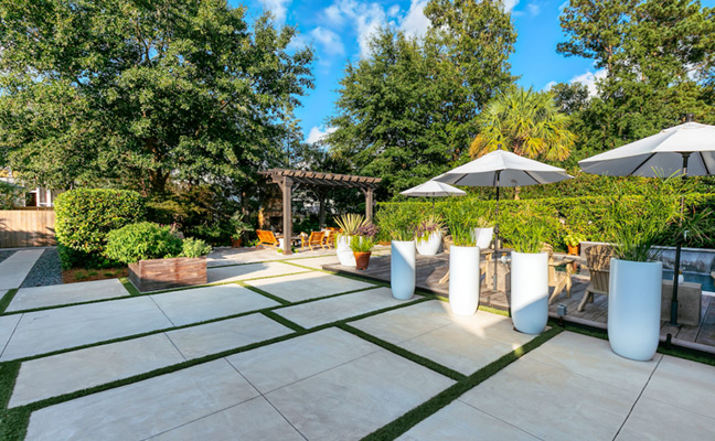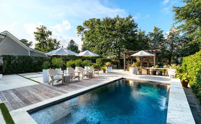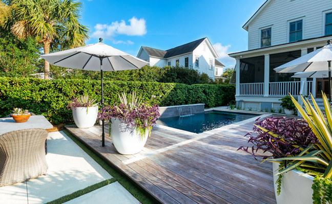 This backyard renovation project took a fairly traditional backyard and turned it into a lowcountry modern designed oasis. The design features a brand new pool with a decorative wall and water shear, natural wood pool deck, space for outdoor dining, new furniture for the existing pergola and fireplace, a space for yoga, a veggie garden planter, and a driveway that merges with the adjacent spaces. New steppers lead to a new outdoor shower space and decorative pots containing non-invasive exotic plant material are placed in locations that help to define spaces and frame certain views.