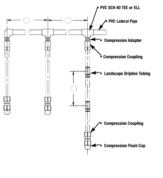 Hydraulic calculations are necessary to ensure that the header is sized correctly for the amount of flow required and that pressure loss is taken into account in calculating the length of tubing runs. A landscape drip design guide is available online by visiting www.rainbird.com/pdf/turf/DripDesignGuide.pdf. This can be helpful in determining maximum lateral lengths and header sizes based on flow rates.