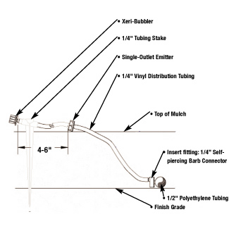 For dense plantings, inline emitter tubing is usually used due to its ease of installation. However, polyethylene tubing with pop-up micro-sprays or PVC pipe with polyflex risers and bubblers can also be used. For sparse plantings, polyethylene tubing with emitters or PVC pipe with polyflex risers and emitters are recommended to better water individual plants and reduce the watering of the soil between plants.