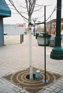Additional types of staking systems include metal pipe, T fence stakes, and guying wires. There are down sides to these types of systems also. The metal stakes usually need a flange or plate just below the ground surface for stability. Removal is difficult and becomes impossible when roots entangle themselves around the flange. Utilization of unsightly guying wires creates hazards in high pedestrian areas and creates mowing obstacles.