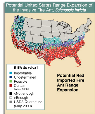 This map predicts areas in the United States that are susceptible to invasion by the red imported fire ant, Solenopsis invicta. Predictions are based on climate and current northernmost distributions of red imported fire ants. To generate these predictions, a dynamic model of colony growth was developed that depended on daily minimum and maximum soil temperatures. An annual precipitation limit was selected to indicate regions where arid conditions may prohibit growth in nonirrigated areas. Results of the model predict that red imported fire ants will likely move 50 to 100 miles north in Oklahoma and Arkansas. They will also likely continue expanding into portions of Virginia, Maryland and Delaware in the east, and New Mexico, Arizona, California, Oregon, Nevada and maybe even Washington and Utah in the west. This study was a joint project of the University of Arkansas at Monticello and the USDA-ARS lab in Gainesville, Florida headed by S.D. Porter, L.C. Thompson, Korzukhin, M.D. and S. Wiley.