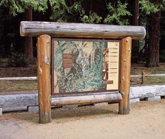 At Yosemite Falls, the signage design was completed by Leslie Stone Associates (who had completed work on other interpretive exhibits in the park). The choice of design firms is crucial to the success of a project like this. A theme developed over many years, creating a continuity of design that is evident throughout the park. This overall scheme includes choice of materials, colors, graphic content and a consistent method of conveying information. This ensures a consistent experience for the visitor as he or she moves from one attraction to others.