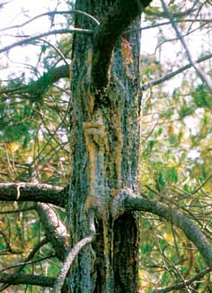 Pitch canker is a disease of pine trees that is caused by the fungus Fusarium circinatum. Douglas fir can also be infected, but this is rare and infected trees are not severely damaged. The disease was first observed in California?EUR??,,????'???s Santa Cruz County in 1986. Since then it has spread rapidly and now occurs in 18 coastal counties. Most pines native to California are susceptible to pitch canker, but Monterey pine (Pinus radiata) is the most widely affected host.