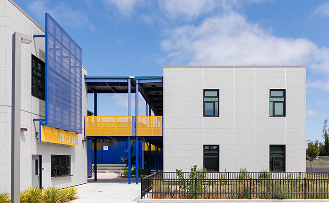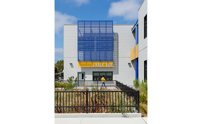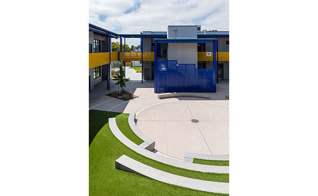 The upcoming School and Campus Design Issue of Landscape Architect and Specifier News saw many firms submit their projects for feature consideration. This project was not chosen for a Feature in the issue, but we at LandscapeArchitect.com thought the project deserved to be showcased online . . . Madison Park Academy is one of several existing Oakland schools recently renovated by the Oakland Unified School District. The campus and new high school are notable for being designed to standards of the Collaborative for High Performance Schools (CHPS), a national movement that strives to create healthy and sustainable school environments. As part of a team led by Byrens Kim Design Works (now DIALOG), PGAdesign developed recommendations and design alternatives to improve the outdoor learning environment of the new high school campus. Program elements include a large circular courtyard within the new high school campus, with a mound covered in synthetic turf and stepped seat walls for outdoor assemblies and casual gatherings. An updated turf area separates the high and middle schools, creating areas for lunchtime seating. Enhanced planting at both school's entries and within the revised parking lot add additional greening to the campus. Stormwater for the new high school is treated in a biotreatment areas, including one incorporated into the existing parking lot.