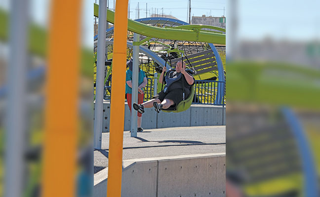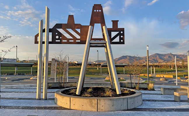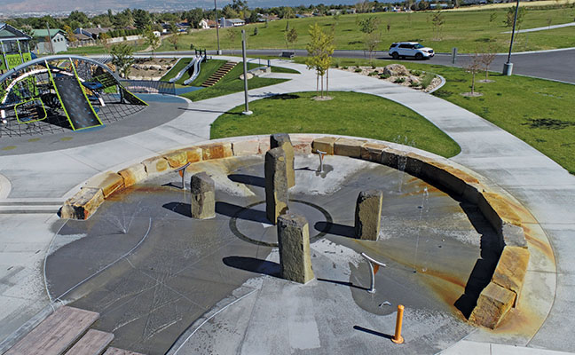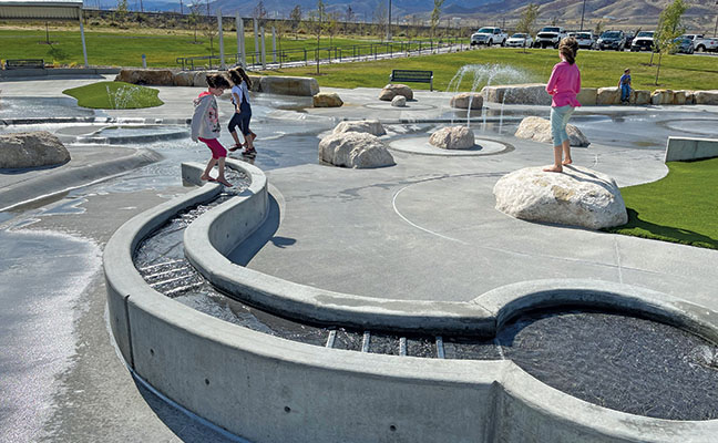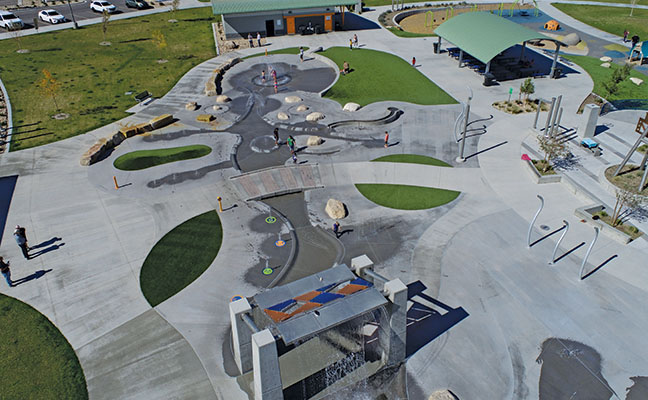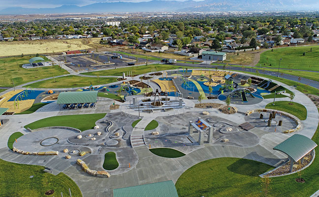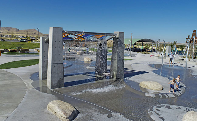 With its inclusive playground and splashpad, landscape architecture firm G Brown Design of Murray, Utah, designed Salt Lake County Parks and Recreation's Magna Regional Park as a new destination park in an underserved area of northwest Salt Lake County, Utah. The playground and splashpad minimizes the stigma of accessibility by creating a play environment where those of all ages and abilities can interact, play, and develop, while providing comfortable, interactive spaces for caregivers. Furthermore, Magna's industrial heritage is celebrated through art, design, and materials. The park also provides value to residents through enhancing the sense of community, connectivity, and increasing opportunities for play. The landscape architect-led team master-planned the 63-acre park and provided construction documents and construction period services for the first 28-acre phase completed in 2021, which includes the two-acre inclusive playground and splashpad. G Brown Design engaged the public through community open houses and a steering committee to obtain key design feedback. Through their efforts, the team decided to use products and materials selected for the park that celebrate Magna's rich industrial heritage of mining and manufacturing. The playground and splashpad displays this industrial theme with an abstract art sculpture and kinetic wind sculptures, along with decorative and play elements that represent concrete columns, I-beams, and stainless-steel pipes. These elements and materials are repeated throughout the park creating a distinct sense of place, tied to the local communities' roots. The inclusive playground and splashpad, which are the heart of the park, provide opportunities for all to interact, play, and socialize without being isolated or singled out. The playground design is particularly noteworthy as it addresses the needs of users with a broad range of physical, social, emotional, communicative, sensory, and cognitive abilities. It also addresses both physical access (how users access various parts of the playground and splashpad) and social access (how users can play in each part of the playground). Often, playgrounds limit children's opportunities for activity and interaction, but this playground demonstrates how social barriers can be eliminated by creating an environment where individuals of all abilities can interact and play side-by-side. A common obstacle of designing playgrounds is programming for equipment, not activities and experiences, therefore, one of the first tasks of the design process was to create a "Play Activity Matrix" to assist with developing a design that addresses the Landscape Architect's 7 Principles of Inclusive Playground Design and the wide range of developmental needs of children. How the 7 Principles of Inclusive Playground Design were incorporated: Be Fair - This principle focuses on minimizing kids being singled out by allowing all to be part of the action. Opportunities are provided for cooperative play by carefully selecting equipment that encourages interaction and group play. These include a wide embankment slide, spinners, basket swing, expression swing, side-by-side zip lines, and interactive water play elements. Be Included - By providing a wide variety of activity choices, such as various types and forms of play, including physical, social, sensory, dramatic, autonomous, cooperative, and parallel play, the playground ensures that all users feel included. All major activities in the playground have an option that can be used side-by-side by people of all abilities: the zip lines, wide embankment slides with accessible path and transfer station, globe spinner with options to sit inside, hang off the edge, or climb and spin from the very top. The design provides a variety of opportunities for children of all abilities to be included and encourages full participation in play.