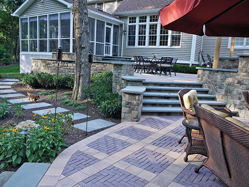 This project consisted of tearing down the home's wood-step entrance to the deck, removing an old patio and building a new entrance to the home's existing screened porch. The project's main focus was to create a more enjoyable backyard experience. To this end, the contractor built two new patios, a putting green, and a playground area that's visible from most of the entertainment areas. The contractor also built steps leading to the new patio and wall around a pigeon coup house.