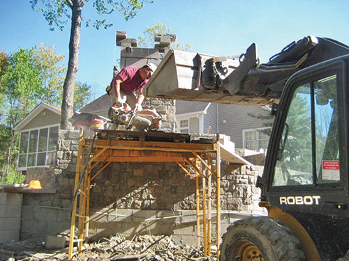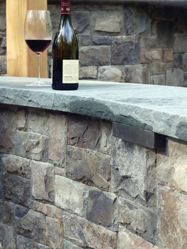 Additionally, all bar tops and fireplace caps are constructed from 2-inch custom-template bluestone with rock face sides. All the stone material was custom, hand-cut to match the dimensions and curvature of the walls, steps and bar area. Neave also built a 100-square-foot patio using brussels block in the lower access area for a seating area outside the pigeon coup; they continued this design in the access steps and catwalk around the pigeon coup. The contractor built the catwalk itself using Unilock Roman pisa wall stone and Brussels pavers accented with a Unilock bull-nose coping.