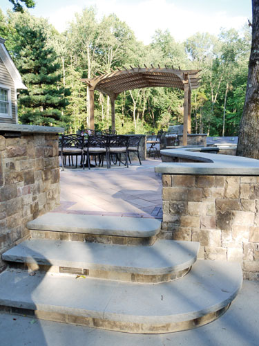 According to the contractor, the project's most challenging aspects involved incorporating the elevation of the upper patio with the lower patio with the putting green and pigeon coup area. Also, the installation of the pergola through the natural bluestone caps had to be perfectly cut for proper installation and fit of the pergola poles. Another challenge was reinforcing the septic system walls to accept the weight of the hardscape. During the construction, the site was hit hard by a 26-inch snowstorm that damaged many of the property's mature trees, which led to extensive tree removal and replacements.