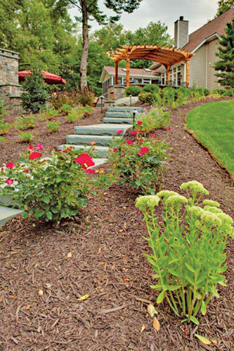 The contractor installed more than 200 linear feet of bluestone steppers as a walkway through the landscape above the putting green and as a walkway from the lower patio to the pigeon coup.