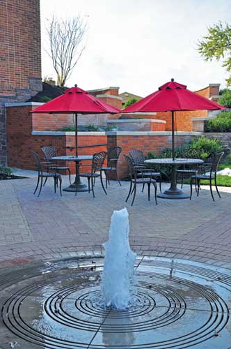 The center stage fountain is a focal point of the lower plaza. It is a flush fountain design with a circular architectural grate. The lower plaza is pitched toward the fountain.