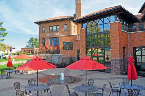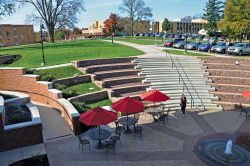 BEFORE & AFTER: The new plaza creates an impressive new entry for Francis Hall (the venerable ?EUR??,,????'??old Main?EUR??,,????'??) at the Alvernia University campus in Reading, Penn. Seat walls, steps, a central fountain and comfortable furnishings define the plaza. Foster holly, dwarf burning bush, green sheen Japanese spurge and Shenandoah switch grass soften the space.