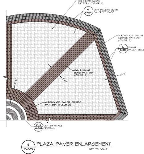 The design of the lower plaza features brick banding and clay pavers. The outer-most bands of sailor-course pavers are set on a temporary bed.