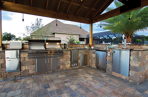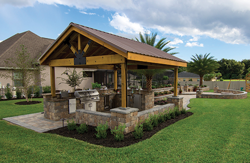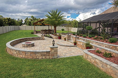 They altered their plans and started laying the materials out on the ground. At that point, it seemed too congested so they quickly made some other adjustments and started building. A spacious, semi-circular patio was constructed using Keystone's Mega Olde Towne pavers in Sierra with a soldier course in granite. Both came "tumbled," a process that creates a rustic and aged appearance. A side patio, walkways and the two steps up to them, used the same materials. Seatwalls, retaining walls and columns throughout were built with Keystone's Stonegate blocks in Sierra and Universal caps in granite. A circular fire pit on the main patio matches this look. Its gas fire ring is from RH Peterson. Glass beads fill the center. All the hardscape materials were manufactured by Tremron, the local Keystone supplier with several locations in Florida. A Culinary Treat Down another walkway, Ultimate Outdoors constructed a covered patio to house the kitchen. Two columns and the kitchen counter were built from the same materials as the walls. Six-by-six, pressure-treated pine posts support a metal roof. To cover the underneath metal surface and to convey a Tiki feel, the team capped the purlins with half-bamboo and installed bamboo thatch in between them. All the wood was stained a honey color. The entire structure was built by Anderson and his workers. "I feel that's what separates us," he asserts. "We do everything from the grading to the drainage to the final product." The kitchen is loaded up with a Pitco deep fryer, a Firemagic barbecue that is a four-burner gas grill on one side and a charcoal grill on the other, a Firemagic ice machine, a True kegerator, and a Blaze refrigerator that was selected for its superior outdoor rating. A bamboo fan with lights and Kichler pendant fixtures brighten the area. Most of the lights throughout the backyard are the same brand. Low-profile, LED cap lights were installed under the wall caps and the steps' treads. Their Radiax floods illuminate the landscape. The lanterns on the columns were purchased by the homeowners but the landscape crew converted the lights to 12-volt LEDs. Planting the Right Balance "I've got big eyes for landscaping," admits Anderson. But the homeowner did not so Anderson had to be resourceful to create a rich landscape while still satisfying these scaled-back expectations. "What my customer wanted was lighter than I would usually do on a project of that size," he says. Two Sylvester date palms flank the patio. Other trees include Miami supreme gardenias, river birches and weeping bottlebrushes. Dwarf bottlebrushes, lady palms, flax lilies, knockout roses, boxwoods, frost proof gardenias and liriope are some of the other plant selections. Later, a raised vegetable garden was added. Ultimate Outdoors did everything on this job except run the gas lines to the kitchen and the fire pits – and they completed it in about four weeks – adding to their portfolio another example of why they, in Anderson's words, "got to be pretty well known in Ocala for doing really cool landscaping and hardscaping."