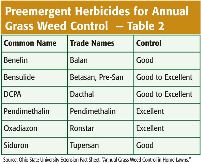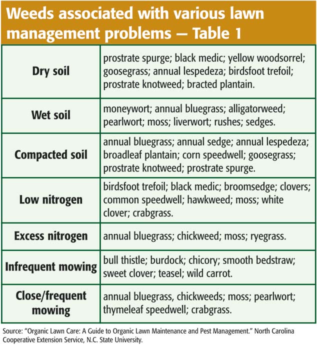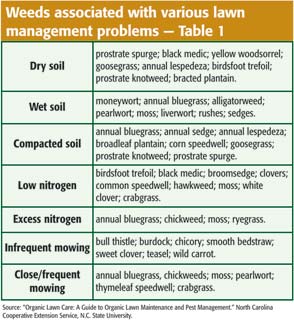 Before we discuss preemergent usage, i.e., herbicides that kill germinating weed seeds while having little effect on the turf, integrated pest management (IPM) teaches that a healthy lawn indicates good cultural and fertility practices and is the best defense against weed problems. Turf mowed at the proper height, fertilized properly (at the correct rates and times) and efficiently irrigated results in minimal weed problems. Such weed conditions in turf can be spot removed by excising the roots with a spade or trowel. Table 1 reveals under what turf conditions certain weeds propagate.