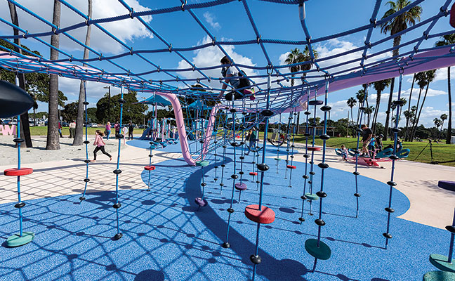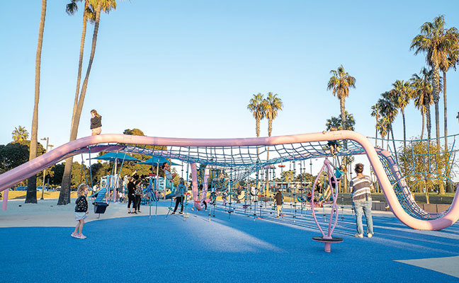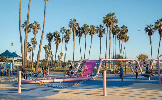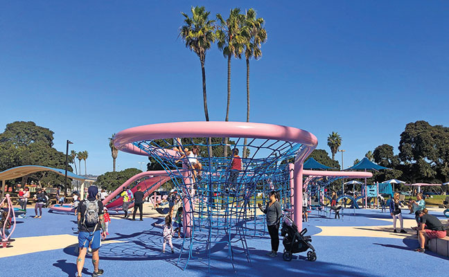 Situated in the iconic coastal landscape of Mission Bay Park in San Diego, California, Maruta Gardner Playground is a whimsical playscape grounded in the history and culture of its beach context. The playground is the latest addition to the Mission Bay Park System and includes a half-acre playground renovation, replacement of a comfort station, new picnic pavilion, enhanced lighting, and accessibility upgrades throughout. The improvements pay homage to the surrounding Mission Bay community and the neighboring historic Belmont Amusement Park which opened in 1925.