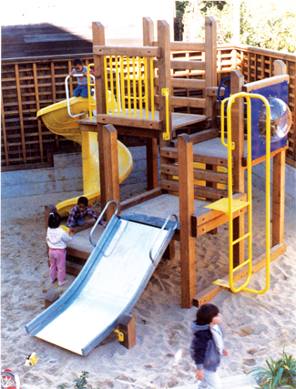 Another children?EUR??,,????'???s play area was built between Turk Street and Buchanan Street, near a pedestrian mall. The urban area was paved with more of the checkerboard modular safety surfacing and given similar play equipment with a double slide and climbing activities.