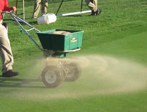 Expert Advice Fertilize the lawn grass early in the month with a slow-release fertilizer like 19-5-9. It releases half of the nitrogen when it is applied and watered in, and then slowly releases the rest of the nitrogen over several months. The immediate release supports the high growth period this month. The label explains what setting should be used on a spreader. If it does not, set it at the lowest level. Use five pounds (five cups) for each 1,000 square feet of lawn.