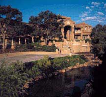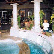 Whereas the front yard was designed as a grand entry, the back yard was primarily designed for entertaining. Here, the clients wanted to be able to have parties which could easily handle 150 to 200 people. One challenge for the Landscape Architects was to keep the landscape structures grand enough to be in scale with the 15,000 square foot house. The back yard is highlighted by a 50-foot negative edge swimming pool, in which the pool water seems to spill into Folsom Lake beyond the horizon. The pool features two circular water slides that cascade down five feet to the lower pool; a telescoping water jet at the center of the pool; a "floating" spa with a semi-circular metal lattice arbor at one pool end; a roofed gazebo with stucco columns; and a built-in cook center at the other end. The spa backdrop wall incorporates the water weirs which spill water behind the spa into the swimming pool. In addition, the roofed gazebo and cook center unit was designed to reflect the building's Mediterranean-style architecture, and includes a gas barbecue, refrigerator, prep counter space, ceiling fan, and restrooms on the back side.