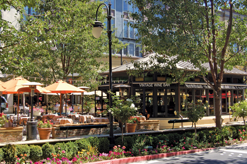Santana Row is a premier pedestrian oriented 40-acre development featuring shopping, accommodations, lofts, apartments, townhouses, parks and sunny tree lined streets. The linear park is the development's centerpiece. Organized around three mature specimen oak trees, the park features a series of outdoor rooms with open-air cafes, restaurants, kiosks, stages, fountains and retail. The design incorporates the best of European and American towns to create a beautiful, charming shopping and living district in the heart of Silicon Valley, blending old world ambience and high-tech comfort.