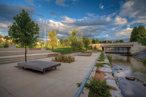 The award winning Market Square, located adjacent to Guelph City Hall, invites people to visit the downtown core for concerts, street parties and markets. The 2.5 acre space is a four-season destination and hub of cultural activity. Seven sculptural shrouds spray water into a shallow oval water feature that is used for splashing in the summer and skating in the winter. Coordinated music, light and sound create dynamic programming for the space. The design of the square is part of a larger urban design strategy to reconnect this growing community with the historic downtown.