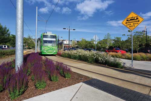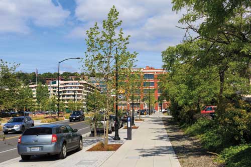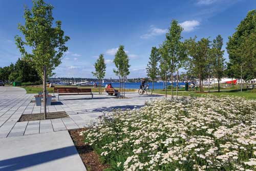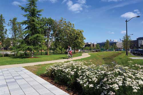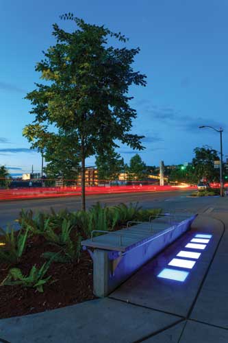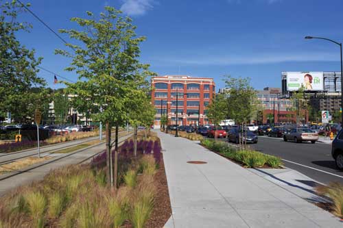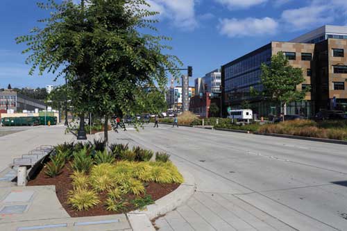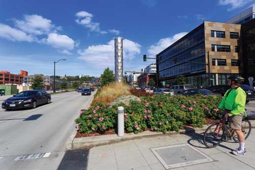 As one of the main entries into the heart of Seattle, the Mercer Corridor functions as a gateway and vital east-west link between the Seattle Center/Space Needle, several Seattle neighborhoods encompassing theater and art districts, technology and biotechnology hubs, and two regional transportation corridors, Interstate-5 and State Route 99. The Mercer Corridor East project is celebrated as a completed and built phase of the city's larger multimodal transportation vision. The Mercer Corridor East project converted a one-way Mercer St./Valley St. couplet into a traditional two-way street grid just north of Seattle's downtown core. Focusing on Mercer Street, Valley Street, and Westlake Avenue North, the new grid promotes strong multi-modal circulation and connections that didn't previously exist in the original automobile focused configuration. The new design highlights the role of transportation corridors in connecting public open spaces and neighborhoods, and the use of sustainable landscape techniques that address stormwater management, flood/drought resiliency, and multiple modes of movement. The 20' wide median on Mercer Street treats stormwater run-off through a cascading series of detention areas planted with a variety of grasses and rushes, and provides space for large, boulevard London plane trees such as the one located behind the sculpture. Over 200 trees were planted for the project, helping meet some of Seattle's urban forest canopy goals. Several breaks located throughout the median provide generous space for pedestrian and bicyclist pause points at street crossings. The design of the seven blocks of streetscape provides a gateway entrance from Interstate 5 and provides a north-south connection from the rapidly developing business and residential areas to Lake Union Park, the Museum of History and Industry, and additional waterfront associated recreation areas and services. Known to Seattleites for years as "The Mercer Mess," the project is part of a larger citywide plan to integrate complete street design principles with transportation infrastructure projects. This plan was envisioned and conceptually illustrated by a multidisciplinary team of engineers, urban designers, and landscape architects more than a decade prior to the start of construction. Receiving partial funding from a federally sponsored TIGER grant (Transportation Investment Generating Economic Recovery), the project implemented complete street principles to improve access, safety, and circulation for increasing numbers of bicycle commuters and pedestrians, several Metro Transit bus routes, two Port of Seattle freight routes, a surface-line streetcar route, and vehicular traffic. Mercer Street's "green fingers," landscaped bulb-outs along the street edges, protrude into the corridor to help delineate street-side parking and to calm traffic. The 16 green fingers are located at intersection crossings and rain garden medians. They are planted with sword ferns, elm trees, and golden Japanese forest grass.