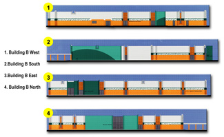 The final design achieved all re-imaging goals with concepts that included demolition of parking lots, walkways and curbs, new and relocated drainage, lighting and irrigation, building painting and graphics, colored and standard concrete flatwork, concrete bench walls, soil import and lawn areas, new plantings, waiting shelters, security gates, trash enclosures, new bicycle parking enclosure area, logo and graphics signage elements and a mural art wall.