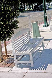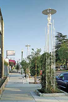A new plaza adjacent to the Metrolink Station marks the entry to the downtown area. Street furniture, bus stop shelters, pedestrian lights, signage and planting were designed for the project to create a pedestrian friendly atmosphere. The master planning and streetscape implementation project were the combined effort of landscape architecture firm Katherine Spitz Associates Inc. and David Denton Architect.