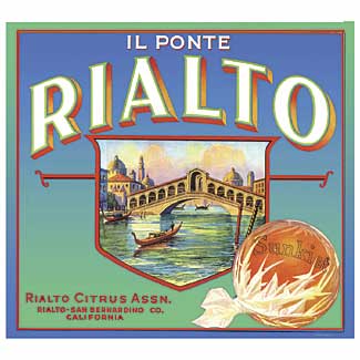 Rialto got its name from a famous bridge in Venice, Italy, called Rialto. At the Citrus Exposition the Rialto Bridge in Rialto was built from oranges.
