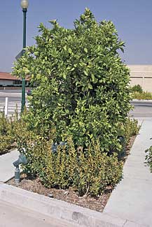 According to Steve Lacap of Katherine Spitz Associates Inc., bubblers were used for trees and spray heads, with either 360, 180 or 90-degree sprinklers used for irrigating bushes. Mostly native plant materials and xeriphytic plants were used. The planting schedule included date palm, Mexican fan palm, silk tree, natal plum, variegated fortnight lily, variegated evergreen euonymus, yellow daylily, starburst double gold ‘monold’, New Zealand flax, cat’s claw and royal trumpet vine. When entering the gateway, orange trees can be seen on both sides.