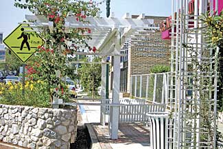 To make this a more pedestrian-friendly atmosphere, Denton included the use of benches, graphics on signage, use of shade trees and better bus stops. Existing trellises were used for shading at seating areas. A clock tower served as a focal point, to encourage pedestrians to use cross walks. One of the goals was to get rid of the messy ficus trees. These features have drawn more attention downtown and helped with the recovery of the area.