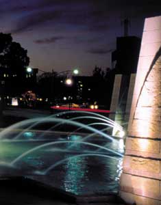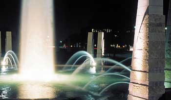 Water is often more dramatic when lit from below or within than from above. From the fountains to the stonework, the nature of this project lends itself well to a variety of night lighting effects. The main fountain is lit from below via a series 419 underwater light fixture by Hobbs, providing waterproof assurance and superb luminescence through the full height of the fountain. Built into the columns, just below the three fountain jets, is a fixture from Hydrell's 7100 series that uplights the spray as it leaves the masonry. The arced jets are seemingly illuminated from within. All lights are controlled by a timer. The overall effect is a fountain that becomes the luminary instead of one simply being lighted by a number of scattered fixtures.