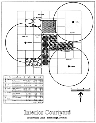 The Interior Courtyard (see illustration) provides an example of a design accompanied by the built-in spreadsheet. Upon opening the MiniCad+ drawing surface, the designer would proceed to do a general sheet layout determining drawing size, scale, units to be used, and display accuracy. In addition to these common procedures, the designer also opens and designs the spreadsheet to supplement the drawing. In the example, the spreadsheet was designed to keep track of material quantities and calculate and summarize costs as elements were added to the courtyard scheme. Columns three and six contain formulas, to be explained below, while the other columns have labels or values as shown.