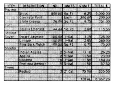 After the spreadsheet is developed, the designer might first draw in the number of brick paving panels needed. The panels would each be assigned to a class called ‘brick paving, using a simple menu command. The spreadsheet (see example) is then opened and the label for the item is entered in the DESCRIPTION column. A formula, = Area(Class:’brick paving’), is then entered into the NO. column. Upon pressing the computer’s Enter key, the calculation of the number of square feet is made and the proper number appears in the cell. This same technique is used for all surface areas of ground cover and turf. The pool structure was entered here with a single cost for the unit. As new items are added, a Recalculation menu command keeps the spreadsheet up to date.