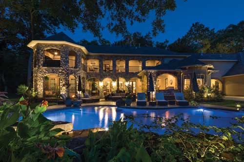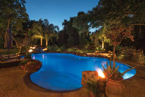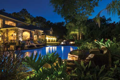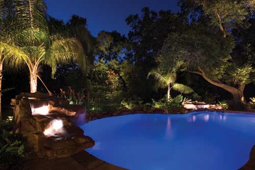 Accenting the falling water and up lighting the palm trees was the main goal here, explains Brandon Kuehler. Six Kichler underwater lights accent the waterfalls. Hiding the underwater lights inside the waterfall was an important feature. This was achieved by mortaring the fixtures into the water feature. To help give the yard more depth the magnolia tree was illuminated with Ravenna MR16 LED bullet lights, as well as some of the native trees behind the fenced in portion of the customer's yard.